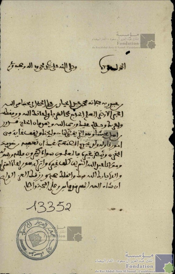 الحمد لله وحده وصلى الله على سيدنا محمد وءاله وصحبه وسلم من عبد ربه سبحانه محمد بن عبد الجبار بن علي الحسني إلى محبنا في الله الخير الأرضى المعلم الحاج محمد الغرباوي أعانك الله ووفقك وأعزك وسلام عليك ورحمت الله وبعد فإن الحاج قدور من أهل محبتنا وهو الذي يقضى لنا حوائجنا ويقف غاية في أمورنا وله ولد يخدم الصنعة فنحبك أن تعقبه من خدمة المخزن وينظر غيره فالمعلمون سواء كثيرون فلله ورسوله ومولانا عبد الله الشريف كلف غيره واتركه هو مراعاة الاحترام والده بارك الله فيك وأبقاك صحبة ورزقك العز الدائم إن شاء الله المهرقد مابين وعلى المحبة والسلام |