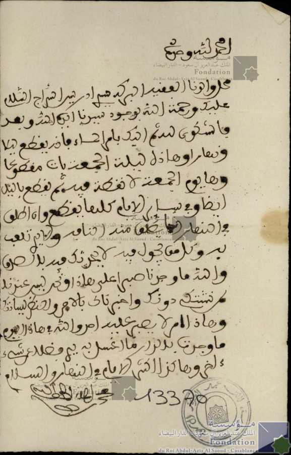 الحمد لله وحده محل والدنا الفقيه البركة سيدي إدريس السراج السلام عليك ورحمة الله بوجود سيدنا أيده الله وبعد فاشكوى لله ثم إليك بامر الماء فإنه يقطع ليلا ونهارا واهذه ليلة الجمعة بات مقطوعا وها يوم الجمعة بات مقطوعا وها يوم الجمعة لا نقظة فيه ثم يقطع بالليل أيضا وفي سائر الايام كلها بقطع وإن طلق في النهار يطلق منه النافع ولا تلعب به وكل من يحول فيه لا يحرك فيه بالصدق والله ما وجدنا صبرا على هاذا ونحن ليس عندنا لمن نشتكي دونك وأخبرناك بالأمر والنظر لسيادتك وهاذا أمر لا يصبر عليه احد والله في هاذا اليوم ما وجدت بالدار ما أغسل به يدي فضلا عن شيء ءاخر وهاكذا أكثر الأيام في النهار والسلام محمد بن المدني لطف الله به |