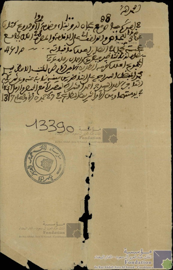 الحمد لله في أجرة جباص 88 مع عجان له بناء 100 وخدمة 11/199 ودروع كتاب عن 3/14 والواقف على الاقامة والمصرف 28 الكل بجامع عجيسة تحمل في الصاير أعلاه ما قبالته ..414 يضاف لذلك قناطير جبص 4 وأحمال رملة 24 المجموع أعلاه خرجه الطالب الامين المحتسب الاحضى سيدي المفضل السراج على الناظرين حينه نيابة عنه وعن شضريكه التاجر الامين السيد ج أحمد الشراط ليصيراه مع الجبص وأرمل اعلاه في يومتهما وفق الأمر الشريف المطاع في 27 جمدى الاولى عام 1317 |