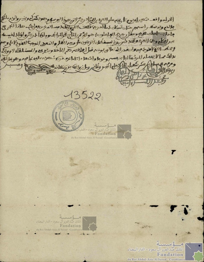 الحمد لله واقف شهيداه يوم تاريخه على العربي بن إدريس الزرهوني اليوسفي وهو يشتكي وبين وثوبه ملطخ بالدم وبوسط رأسهم حتان تسيلان دما أحدهما قطعت الحم والجلد فسأله عن من فعل بك هاذا الجرح فأجاب بلسان صحيح وعقل رجيح الفاعلون هو السيد حم الحاج محمد المرابط وولده إدريس وأولاد أخيه عبد السلام وهما العربي ومحمد ضربوه بمسقطان الزيتون على وجه الظلم والتعدي الموجب للقود لا على وجه الخطا الذي لا قود فيه وإن قدر الله تعالى بموته قبل اقامته هم المأخذون بدمي والمستلقاة غلى دان لذلك مما لا يفعله المرء غالبا بنفسه وقوفا واشهادا تاما عرف قدره شهد به عليه بما فيه وهو بحال كماله وعرفه في سادس عشر شعبان الابرك عام اثنين وثمانين ومايتن وألف عبد ربه سبحانه
