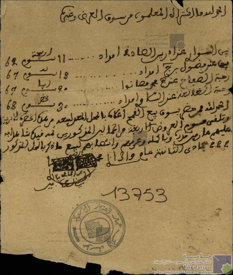 الحمد لله ما اشتراه المعلمون من سوق العرض وغيره بين السواري عند إدريس الصادقي امداد 11 سوم ربيحة 62 فيها عند فضول بن ج امداد 18 سوم له 67 رحبة الصفاح عند ج محمد مصانوا 20 سوم أبيا 67 رحبة الطالعة عند السلاوي أمداد 30 سوم لخضر 68 الحمد لله فمن حضر بسوق بيع القمح أعلاه بالمحل المعد لبيعه من هذه الحضرة الادريسية وتلقى سوم العروض الأربعة من الحمالين المذكورين ثمة قيده شهد به عليه وهم عارفين قدره وباكملهم وعرفهم وانتصابهم لبيع ما ذكر بالمحل المذكور في 22 جمادى الثانية عام 1319 |
