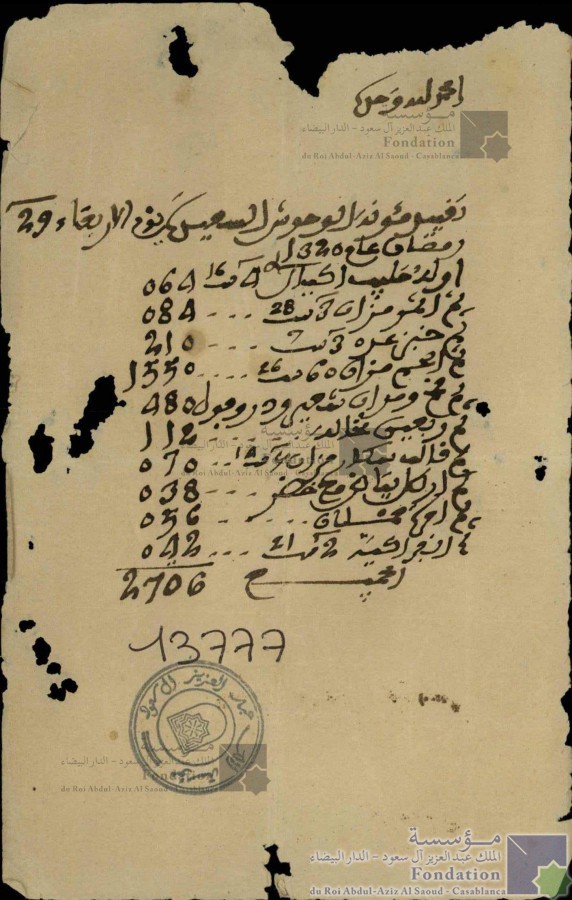تقييد مؤنة الوحوش السعيدة يوم الأربعاء 29 رمضان عام 1320 أوله حليب أكيال 4 س 16 ....064 ثم المد مزان 3 س 28..........084 ثم خبز عد 30 س ....210 ثم الحم مزان 60 س 26 1550 ثم قمح ومدان شعير ودر وفول 480 يم ربعين نخالة ...112 ثم قالب سكار مزان 4 س 14....70 ثم ارطال بياض خضر 038 ثم اجرة حملان 056 ثم الفراكية 2 س 21....042 الجميع 2706