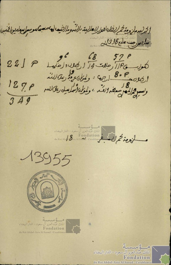 الحمد لله ملزومة لحم الضأن للدار العالية بالله وما أضيف لها حسبما هو مبين أسفله يوم الخميس سادس رجب عام 1318 طوابق 11/57 رجلات 14/68 ارطال داخلها 96 221 ارطال 80 خارجها ولمولاي عرفة 19 رعاه الله وسيدي محمد المهدي 18 حفظه الله ولمولاي إسماعيل 10رعاه الله 127 349 ملزومة لحم البقر 18 |