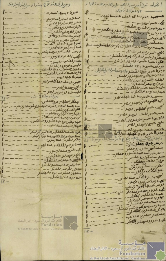 الحمد لله تبن الامين سيدي الطيب على يد صاحبه حمان الحمياني في الأحد 25 شوال سمحمد حم سيد محمد عند زمور 2 محجوب حم لمنيعي عم حمم القدور خضر1 عبد الرحمن حم سد محمد شوعدر وصلص 1 المختر حم سي حمدش 1 بنسلمن صفر عند أحمد 1 حمد عوض حمم قنطرت برص لقشار 1 بلحج حم سجند لقشا1 معزوز حمم قنطرت برص لقشل 1 ملي حمد حمم نوعرين لقشل 1 دريس حمم جيش لقضل 1 مبرك حمم جيد لقشل 1 سد دريس حم سد عزوز لقش1 لفقه حمم نوعرين لقشل 1 عبد السعيدلتمدرت1 حمد بلمهد حمم لقلقين لقشا 1 عبد السوبس فشل 1 سمحمد حمم سد محمد بلفقه لهدي 1 محمد ضم وحم السجند لهدي 1 لعجب حمم لمخفي لهد 1 عمر حمم لقت لهد لهد 1 فلحمد حمم نوعرين لهد 1 بلحج حمم اسجند لهد 1 درس حمم جيد لهد 1 مبروك حمم جيف 1 وفي الاثنين 26 منه عند سي الطيب ءاخر صغير أعلاه من عندنا 24 درس جيف حمد تمدرت 1 بنسالم صفور 1 عبد حمد سمحمد شور وملطل 1 جبل سد عزوز وصلص 1 ملحة لقة خليط 1 لعرب سبوس زمر 1 سد حمد لحدد زمر 1 لمحجب زقة لهم عند لهد 1 حمد زقق لهم عند لهود 1 درس جيمعا أمر تزلبطم1 محمد ضرور سمحمد عند بل عرب 1 حمد لقلقلين لقش 1 لعرب سبس لقشا 1 سد حمد لحدد لقشل 1 عبد الرحمن مسد حمدوش لقشل 1 جبل سد عزوز لعد 1 بنسلمن صفر عند عبد 1 محمد ضرور سجند لهند 1 وفي الثلاثة 27 شوال من التبن المقيد يمنته مبرك حفيظ لتمدرت 1 سد محمد لمجدوب أمد تزليطهم 1 حد لقوس أمر تزلبطح 1 جبل سد عزوز وصلط 1 قدور لقوص وصلص 1 لمختر سد حمدوس 1 بنسلمن صفرو وصلص 1 مبروك جيف عند عرنط 1 عبد اسبشس عند هود1 درس منيب درس عند زمر 1 محجب زقاق لم عند زمور 1 حمد زقق لهم عند زمر 1 سيمحمد نوعرين لقشا 1 معزوز منصرت فرض لقش 1 مبروك جيد لهم 1 حمم بلمعط لقلقين لهم 1 بلحج السجند لهم 1 ملين حمد نوعرين لهم 1 وفي الأربعاء 28 منه 19 لبقال سمحمد بوصفر 1 سد حمد لحدد لمن سمفضل غرنط زبير 1 صلح لقتل وصلص1 جبل سي عزوز صلص 1 لمختر سيد حمد شو لتمدرت 1 عبد الرحمن سد حمد شهور وصلص عبد اسفل عند بلعد 1 حمد بلمهد لقلقلين عند أمر تتزلهم1 سد برهم لقلقلين عند أمر تزليهم 1 جلل لقوص عند زمر 1 سد برهم لقلقلين عند لهد 1 محمد ضرو وعند لهور 1 بلحج سجند عند زمور 1 سمحمد نوعرين لقشا 1 عبد رحمن سد حمد شو لقشا 1 جلل لقوسة لقشا 1 معزوز قنطرت بروص لقشا 1 حمد عروض لقشا1 18 وفي الخميس 29 من الشهر حوله والتبن لمن ذكر حوله لفقه نوعرين عند تمدرت 1 صلح لقة عند لودغر 1 لفقه نوعرين وصلص 1 لمختر سيد حمدوش وصلص 1 عبد الرحمن سيد حمدوش وصلص 1 دريس حفيظ عند لهور 1 مبروك حفيظ عند لهور 1 لمحجب زنقت لهم لقشل 1 حمد زقق لم لقشل 1 جبل سيد عزوز لقشل 1 حمد بلمهد لقلقلين لقشا 1 سد دريس عزوز لقسا1 صلح لقة عند بلعد1 سد برهم لقلقين عند أمر تزلهم 1 خلل عند زمور 1 معزوز قنطرت بروص لقل 1 جـ 17 |