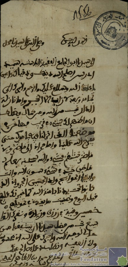 الحمد لله وحده وصلى الله على سيدنا محمد غلى سيدنا أبو الجامع الفقيه الباشا سيدي إدريس أصلح الله دينك ودنياك ءامين برعاية الله وسلام عليك ورالرحمو والبركة إلى تمامه وبعد لازايد الخير وأما نازلة الدار نحب من الله ومن كمال فضلك ان ما ظهر لك شيء في قريب فها نحن في موضعنا الذي انزلنا فيه امرك حتى يفرج الله علينا وأما جراني إلى حاضر واني ما ضرينهم بشيء والله سبحانه يعلم ما جد حد في شيء سوى الله وأنت والذي الحوايج ولد الحسين الجرواني الذي كانوا تحت يدنا باشة الله كما خبرنك عليهم قبل اليوم وضننت ما يقدني في تحويلهم خمسين وقية في رزقي وزيادة ونظرك واسع نحب من فضل سيدنا أن يشفعوا من حالي لوجه الله وأجرك على الله اني محسوس ولك العافية ونطلب دعاء صالح منك وسلام الحاج حم ابن الطاهر الحجي أمنه الله ءامين |