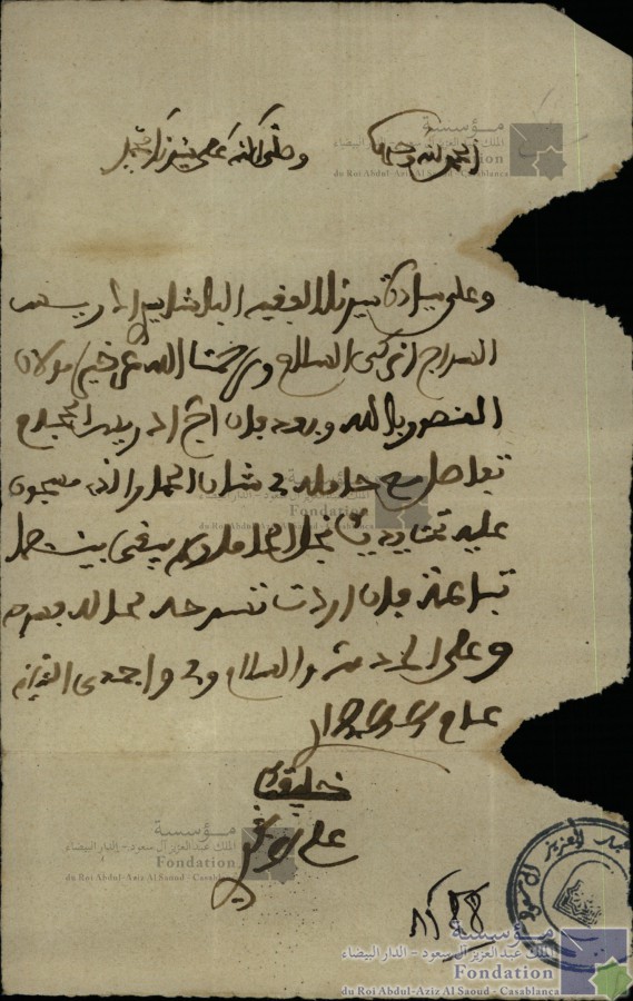الحمد لله وحده وصلى الله على سيدنا محمد وعلى سيادنا الفقيه الباشا سيدي إدريس السراج ازكى السلام ورحمت الله عن خير مولانا المنصور بالله وبعد فإن اج إدريس الحجام تفاصل مع حامله في شأن الحمار الذي مسجون عليه تحت يدي نجل الحامل ولم يبقى بينهما تباعه فإن اردت تسرحه لحاله فسرحه وعلى الخدمة والسلام وفي 19 جمدى الثانية عام 1288 خليفتك علي المزكيتي |