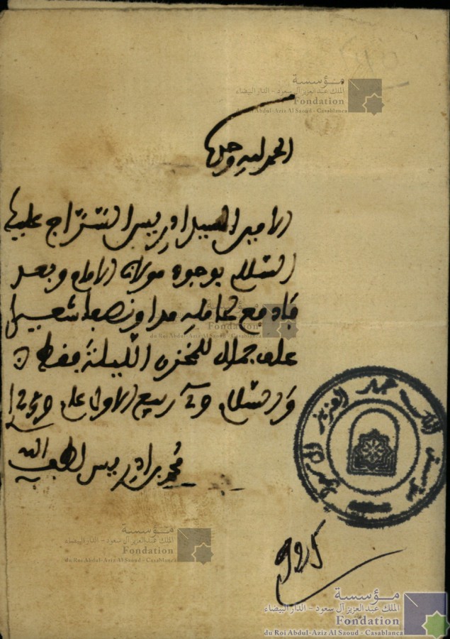 الحمد لله وحده وصلى الله على سيدنا محمد خديم المقام العالي بالله الفقيه النبيه الخير النزيه سيدي إدريس السراج سلام عليك ورحمت الله عن خير مولانا أيده الله وبعد نحب من الله ومنك ان ترسل لنا ثلاثة من أصحابنا مساجن للسجن ولابد بارك الله فيك والسلام في 20 ربيع النبوي عام 1286 خديم المقام العالي بالله قايد بني ورياجل الطالب عبد الله بن الفقيه بن العربي الورياجلي أمنه الله |