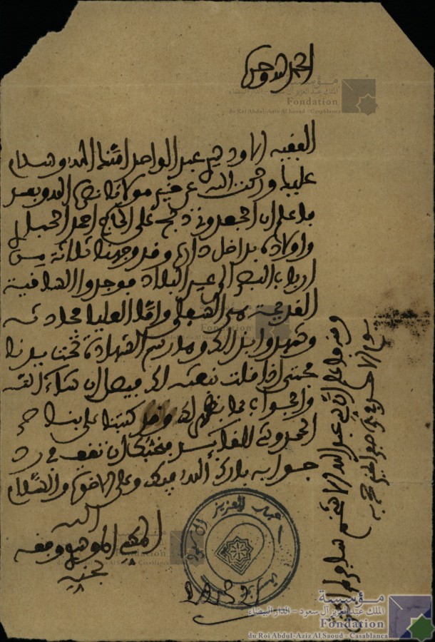 الحمد لله وحده الفقيه الاود سيدي عبد الواحد أمنك الله وسلام عليك ورحمة الله عن خير مولانا نصره الله وبعد فاعلم أن الجعروني دفع على الحاج أحمد الحباري واولاده بداخل داره وقد وجهناه ثلاثة من أرباب البصر إلى عين البلاد فوجدو الساقية القديمة هي السفلى وأما العليا فحادثه وشهدوا بذالك وها رسم الشهادة تحت يدنا فحتى إذا قلت نبعثه لك فيصل إن شاء الله والجواب بما ظهر لك وقد كتبنا على بناصر الحمدوشي للقايد فنحبك أن تقف في رد جوابه بارك الله فيك وعلى الاخوة فيك وعلى الأخوة والسلام المكي الموسوي وفقه الله بمنه ومنه فاعلم أن سي عبد الله الاشخمي سافر لمراكش يوم الأحد في متم صفر الخير |