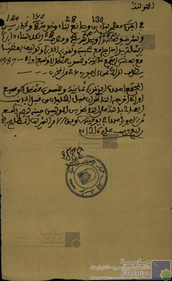 الحمد لله في أجرة معلمين بناءين وصانع بناء وخدمة 8 ونجارين ونشر خيوط ويد شريط ومصرف الكل لبناء جايرة برشلة بداخل جامع عجيسة وتقويم الجايزة وتوليف بعضها مع بعض اجتمع ثمانية وخمسون مثاقالا وسبع أواقي 0487 يضاف لذلك ثمن ءاجور 24 من المخزن المجمع أعلاه الذي قدره ثمانية وخمسون مثقال وسبع أواقي أخرجه الناظران قبل المكلفان من قبل الجانب العالي بالله على الناظرين الموليين حينه ليصيران مع ثمن الأجوز أعلاه في يوميتهما وفق الامر الشريف المطاع في رابع رجب عام 1316 |