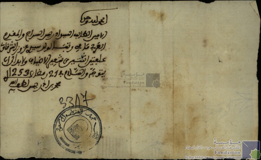 الحمد لله وحده الأمين الطالب السيد إدريس السراج والمقدم العربي مامي رتبا الولد سيدي عزوز الشرقاوي علفتين اثنين من شعير الأضياف ولابد إلى أن يتوجه والسلام في 21 رمضان 1253 محمد بن إدريس لطف الله به |