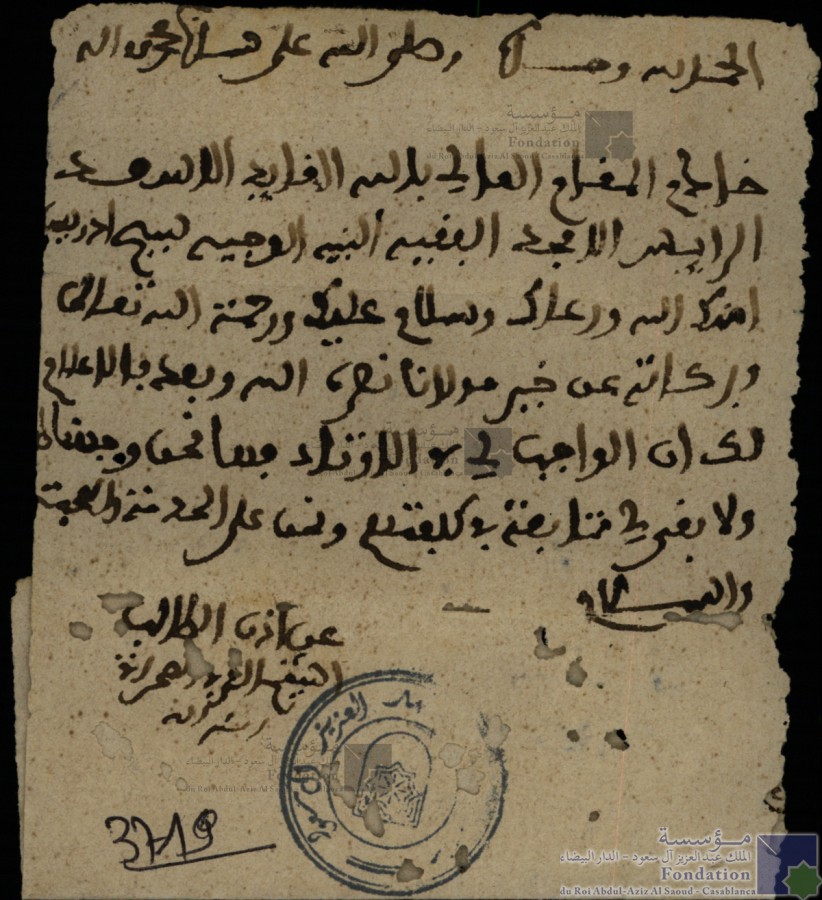 الحمد لله وحده وصلى الله على سيدنا محمد وءاله خادم المقام العالي بالله القايد الأسعد الرايس الأمجد الفقيه النبيه الوجيه سيدي إدريس أمنك الله ورعاك وسلام عليك ورحمة الله تعالى وبركاته عن خير مولانا نصره الله وبعد فالإعلام لك إن الواجب لي في الأوتاد فها نحن وجهناه ولا بقي لي متابعة في كلفتهم ونحن على الخدمة والمحبة والسلام عن إذن الطالب الشيخ العربي الصخراتي أمنه الله |