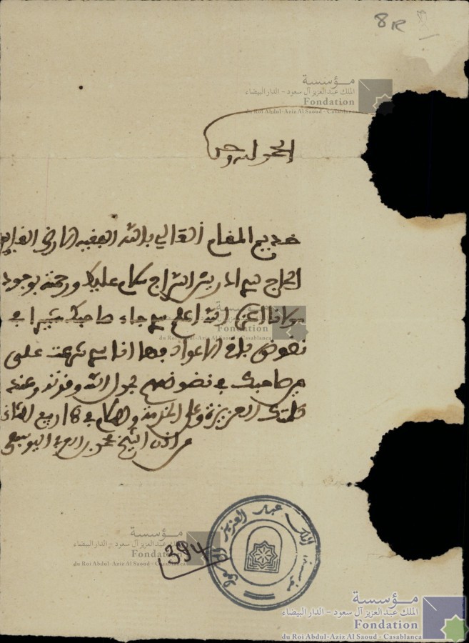 الحمد لله وحده خديم المقام العالي بالله الفقيه الأرضى القايد الحاج سيدي إدريس السراج سلام عليك ورحمته بوجود مولانا أعزه الله اعلم سيدي جاء صاحبك مشيرا في نضوض باقي الأعواد فها انا سيدي شرعت على عين صاحبك في نضوضهم بحول الله وقوته وعند كلمتك العزيزة وعلى الخدمة والسلام في 18 ربيع الثاني عن إذن الشيخ محمد بن العربي اليوسفي |