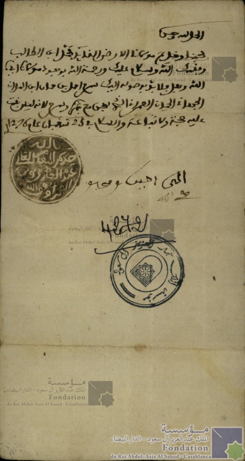 الحمد لله وحده محبنا وخديم مولانا الأرضى القايد محمد بن الطالب وفقك الله وسلام عليك ورحمة الله بوجود مولانا أيده الله وبعد فلابد بوصله إليك سرح أحمد حمان ابن المداني الجهاني الحماني العمراني الذي سجن مع غمرة وسرح لأنه ليس بقت عليه حجة ولا تباعه والسلام في 25 شعبان عام 1276 خديم المقام العالي بالله عبد القادر بن العلامي وفقه الله إلى أحبب ومحبو يبحث عن هذا المسجون إن كان عامله نبحث فسرح له وإلا فلا ريال يجب........162 ومفردة 45 أيضا ............003 الجميع ......810 يدا مفردة 61 القايد 45 وايضا 3 |