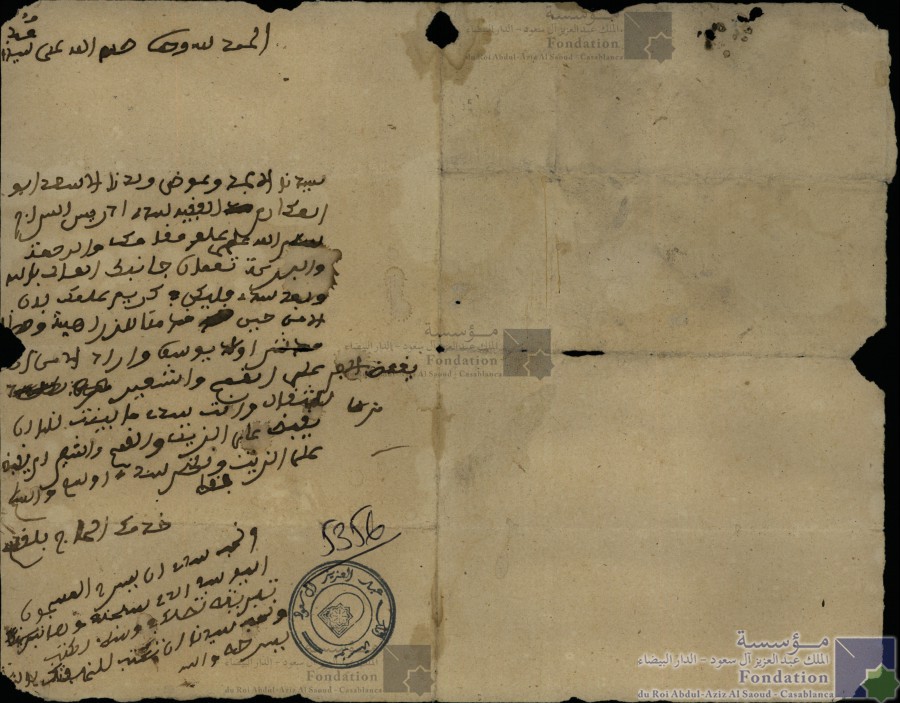 الحمد لله وحده صلى الله على سيدنا محمد سيدنا الأمجد وعوض ولدنا الأسعد أبو المكارم الفقيه سيدي إدريس السراج سرج الله علمك علم مقامك والرحمة والبركة تعمان جانبك العالي بالله وبعد سيدي فليكن في كريم علمك بان الامن حين خدمتا للزراهنة وهذا مدشر أولاد يوسف واراد يقض الأمر على القمح والشعير للمثقال وانت سيدي ما بينت للذان يقبض على الزيت والقمح والشعير أمر يقبض على الزيت ونظر سيدي أوسع والسلام خديمك الحاج بلقاسم ونحب سيدي أن يسرح المسجون اليوسي الذي سجنه وها رسم تبرئته تصلك وسة الكتب ونحب سيدنا أن تسرحه لمحبتك بالله يسرحه والله |