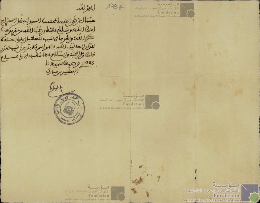 الحمد لله حبنا الأرضى الفقيه المحتسب السيد المفضل السراج أمنك الله وسلام عليك ورحمت الله عن خير مولانا نصره الله وبعد فأي سبب لتعطيل الحلواه المعتادة للدار العالية بالله في المواسم فلابد بين لي سبب تعذر ذلك وعلى المحبة والسلام في 18 شعبان الأبرك عام 1325 وصيف سيدنا البشير مبارك |