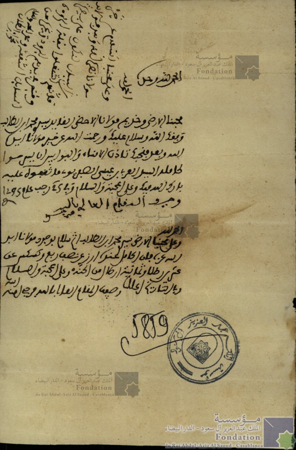 الحمد لله وحده محبنا الأرضى وخديم مولانا الأحضى القايد سيدي محمد بن الطالب وفقك الله وسلام عليك ورحمت الله عن خير مولانا أيده الله وبعد فنحبك تأذن الامناء والبوابين يسرحوا كامله السيد العربي بن عيسى الصفروي ما ثقفوه عليه بارك الله فيك وعلى المحبة والسلام وفي 25 رجب عام 1275 وصيف المقام العالي بالله فرجي الحمد لله وعلى محبنا الأرضى سيدي محمد بن الطالب أتم السلام بوجود مولانا أيده الله فإن الحامل عنده أرز عن نصف ربع وكسكس عن عشرين وثمانية أرطال من الحنة وعلى المحبة والسلام وفي التاريخ أعلاه وصيف المقام العالي بالله فرجي أمنه الله الحمد لله وعلى محبنا السلام عن خير مولانا نصره الله وبعد فولابد من البيان لنكون عاى بصيرة فانهم اشتغلوا بقلة المرؤوة وقبض في يدهم الببرود وغيره من المسائل المثقفة وعلى المحبة والسلام محمد بن الطالب |