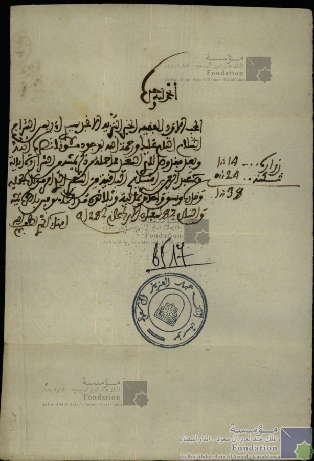 الحمد لله وحده وصلى الله على سيدنا محمد وءاله خديم سيدنا الأرضى القايد محمد بن الطالب السلام عليك ورحمت الله وبركاته عن خير مولانا نصره الله وبعد فمر من بحرم مولانا إدريس من الحياينة بالقدوم علينا ولابد إن كانوا لا زالوا هنا لك وغذا مر بكم ولد الحمير فإنكما بمكناسة اقبض عليه واخبر به سيدنا نصره الله والله يعينك ويأيدك في 20 من محرم عام 1275 العباس لطف الله به |