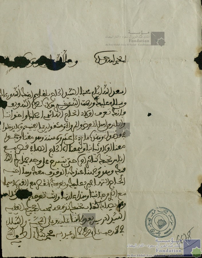 الحمد لله وحده وصلى الله على مولانا محمد وءاله أسعد الله أيام محبنا السيد الحاج بلقاسم أمنك الله ورعاك وسلام عليك ورحمت الله عن خير مولانا نصره الله وبعد فإنك تعرف أولاد الحاج الهاشمي أصلحنا وإخواننا وأناس من أهل العرض والمرأة ومشغولين بما يعينهم ولا يدخلوا في فضول وهذه ما يزد على عشرون سنة وهو معنا وحجوا معنا اولا وثانيا وسمعنا أن الحاج الصافي قبض مع أناس نحبك تباشر أمره حتى يتسرح على وجه جميل برك الله فيك وهو وجهنا عندك بالوقوف معك وها أخيه الحاج التهامي يرد عليك ونعرفك لا تقصر مع الغير لا فيها مع الذي من جانبنا وهذا عارنا وأنت تعرفهم وكل أحد يصلك كتاب نحبك تدفعه لمحب الجميع الفقيه السيد إدريس بعد سلامنا عليه وعلى المحبة والسلام في 8 رجب عام 1289 عبد ربه محمد بناني لطف الله به