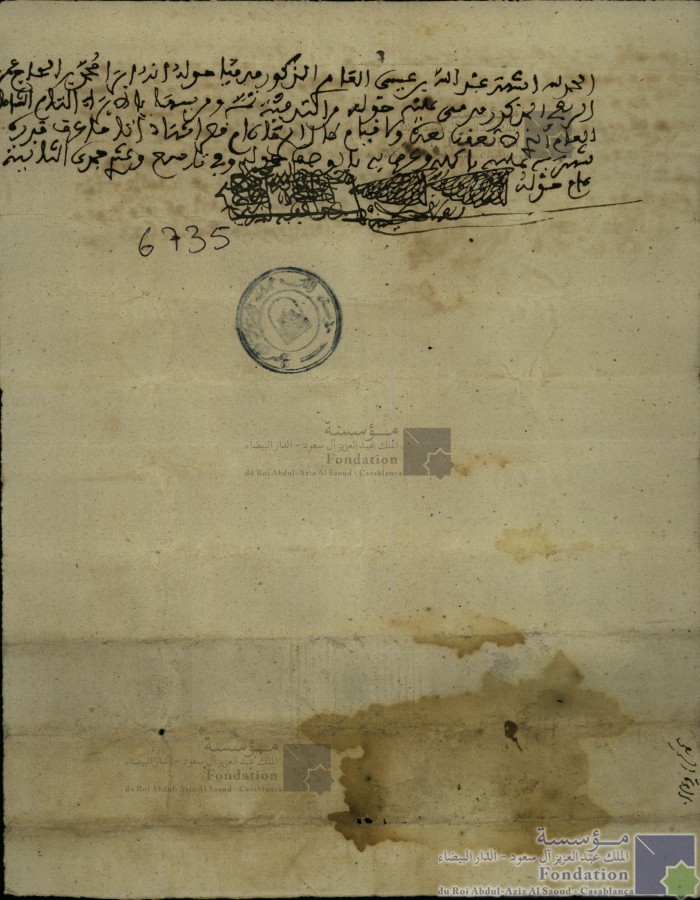 الحمد لله اشهد عبد الله بن عيسى العامري المذكور مرميا حوله أنه أبرا محمد بن الحاج عمر الريفي المذكور مرمى عليه حوله من التذمية ثمة ومن بينها على الإبراء التام الشامي العام الذي تعنا بعد ولا قيام لها طال الزمان او قصر اشهادا تاما عرف قبره شهد به عليه بأكلمه وعرف به بالوصف حوله وفي تاسع وعشرين جمدى الثانية عام حوله الحمد عن إذن من يحي سدده الله وارشده على لسان عونه مالك السوسي عاين شهيداه سامحهما الله بمنه رجلا سمي نفسه عبد الله عبد نبي العامري والميموني ومجاجبه الايسر جرح شق الجلد وعاص في اللحم يترواد ما ونورت عينه بسب ذلك فسأله سيداه عمر فعلا فذلك فذكر أنه كان دفع لمحمد ضمان الحاج عمر الريفي الولهاني اناسا على أن يحرت بها وله سمح في الحرث ولما ذهب عنده أمس تاريخه ليحوزر الا أن عمد فيه وضربه يحجز جرحه الحرم الموصوف على وجه الظلم وابتعد فإن اصابة شيء بعينه فالرجل المذكور وهو الواحد بذلك فمن عاين ما ذكر كيف ذكر على لسان العون المذكور وعرفه وانتصابه وسمع من الذي أكرما ذكر كيف ذكر على أنهم ما سطر حينه عينه وهو عارف قدره وباكمله وعرف به مع وصفه ربعه ضامن بلا شفته قرب أنفه حين فرح وفي حادي عشر جمدى الأخيرة عام تسعة وثمانين ومائتين وألف