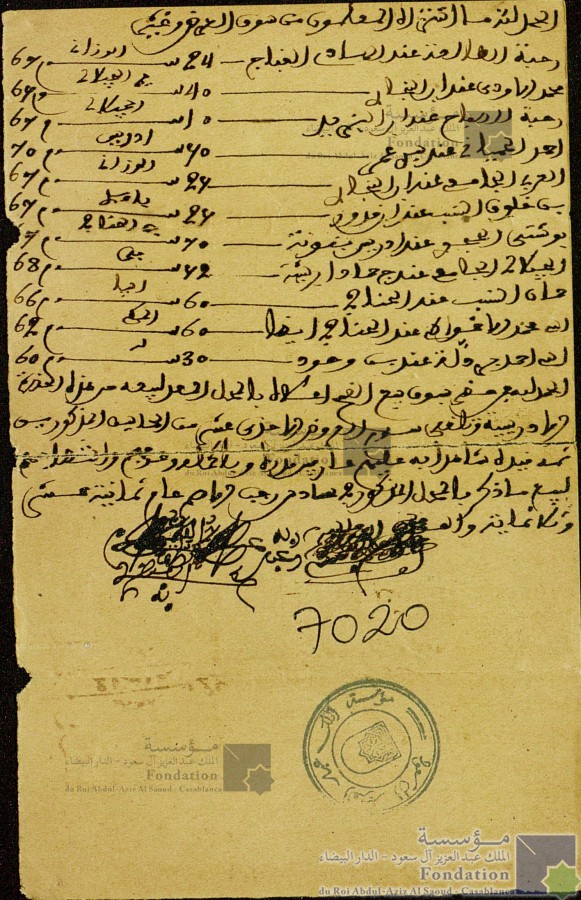 الحمد لله ما اشتراه المعلون من سوق العرض وغيره رحبة الطالعة عند الهادي القباج ....24 سوم الوزاني 67 محمد الاودي عند بن البخاري..............40 سوم ج الجيلالي 64 رحبة الصفاح عند ابن اليزيد...............10 سوم 67 أحمد الحمياني عند سيدي عمر..............40 سوم 70 العربي الجامعي عند ابن النجاري ........24 سوم 67 بن خلوق النسب عند قدور .............24 سوم 67 بوشتى المحجوي عند ادريس بنونة .......70 سوم 67 الجيلاني الجامعي عند ج حماد ابريشة.......42 سوم 68 حمان النسب عند الجنادي.............60 سوم 66 السي محمد الاغواطي عند الحناوي أيضا ....60 سوم 62 السي أحمد بردلة عند وحود........30 سوم 60 الحمد لله فمن حضر بسوق بيع القمح أعلاه بالمحل المعد لبيعه من هذه الحضرة الإدريسية وتلقى سوم العروض الاخرى عشرة من الحمالين المذكورين عند قيده شاهدا به عليهم وهم عارفون قدره وباكملهم وعرفهم وانتصابهم لبيع ما ذكر بالمحل المذكور في سادس رجب الأعظم عام ثامنية عشر وثلاثماية وألف |