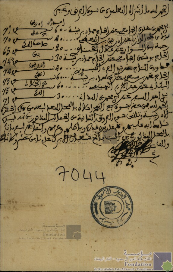 الحمد لله ما اشتراه المعلون من سوق العرض وغيره سيدي محمد بن خلدون الجامعي عند الحاج حماد بريشة ...60 سوم 71 مولاي علي الوزاني عند إدريس بن المعطي ....................40 سوم 70 رحبة بين السواري عند علال الحسناوي ..............20 سوم 65 الحاج بوشتى الجامعي عند الحاج حماد بريشة 30 سوم 74 قدور بن التاج عن سيدي العربي الميسوري ...40 سوم 74 الحاج محمد بن مسعود عند ح حماد بريشة ...60 سوم 75 البكاي عند عبد الكريم الهيني .....60 سوم 75 سيدي أحمد السفر عند سيدي محمد بن المداني ....30 سوم 71 الحمد لله فمن حضر بسوق بيع القمح أعلاه بالمحل المعد لبيعه من هذه الحضرة الإدريسية وتلقى سوم العروض الثمانية من الحمالين المذكورين عند قيده شاهدا به عليهم وهم عارفون قدره وبأكملهم وعرفهم وانتصابهم لبيع ما ذكر بالمحل المذكور في يوم السبت فاتح شعبان الأبرك عام ثامن عشر وثلاثماية وألف |