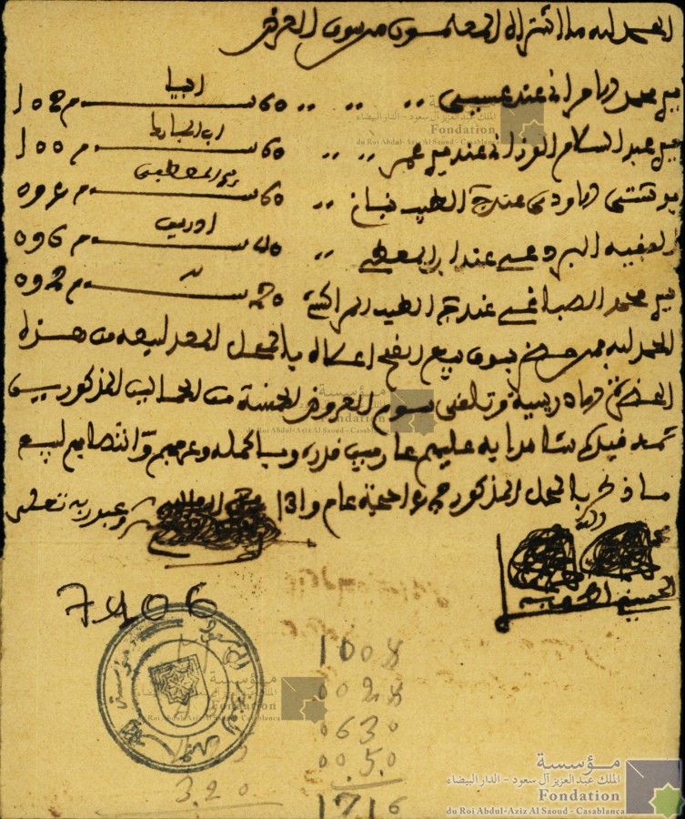 الحمد لله ما اشتراه المعلمون من سوق العرض وغيره سيدي محمد الامراني عند عيسى ..............60 سوم 102 سيدي عبد السلام الوزاني عند سيدي عمر........60 سوم 100 بوشتى الاودي عند ج الطيب بناني ...............60 سوم 094 الفقيه البردعي عند ابن المعطي ................40 سوم 096 سيدي محمد الصباغي عند ج الطيب المراكشي ..20 سوم 092 الحمد لله فمن حضر سوق بيع أعلاه بالمحل بالمحل المعد لبيعه من هذه الحضرة الادريسية وتلقى سوم العروض الخمسة من الحمالين المذكورين ثمة قيده شاهدا به عليهم عارفين قدره وبأكمله وعرفهم وانتصابهم لبيع ما ذكر بالمحل المذكور في14 حجة عام 1319 |