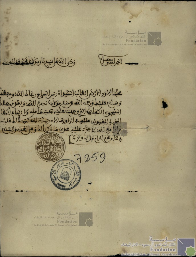 الحمد لله وحده وصلى الله على سيدنا ومولانا محمد وءاله محبنا الأود الأرضى الطالب السيد إدريس السراج رعاك الله وحفظك وسلام عليك ورحمت الله عن خير مولانا نصره الله وبعد فيصلك المسجون الكفايتي الذي وجهت عليه صحبة حامله ولا زلنا في انتظار المخزني المقبوض عليه في الزاوية الإدريسية التي كتبنا لك عليه مرارا مع أنه لا حجة عليه عدى ما ذكرنا لك وعلى المحبة والسلام في 12 من محرم الحرام فاتح 1279 خديم المقام العالي بالله محمد بن أحمد وفقه الله |