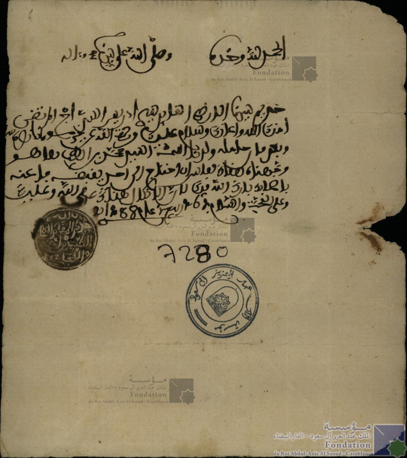 الحمد لله وحده وصلى الله على سيدنا محمد وءاله خديم سيدنا الارضى القايد سيدي إدريس السراج المرتضى امنك الله وأعانك وسلام عليك ورحمت الله عن خير مولانا نصره الله وبعد فإن حامله ولدنا اسمه السيد محمد بن الطيب ها هو وجهناه هناك لفاس ان احتاج إلى أحد يقبضه فاعنه بأصحابك بارك الله فيك لأن الاتكال هناك على الله وعليك وعلى المحبة والسلام في 26 ربيع 1 عام 1288 خديم المقام العالي الطيب بن أحمد |