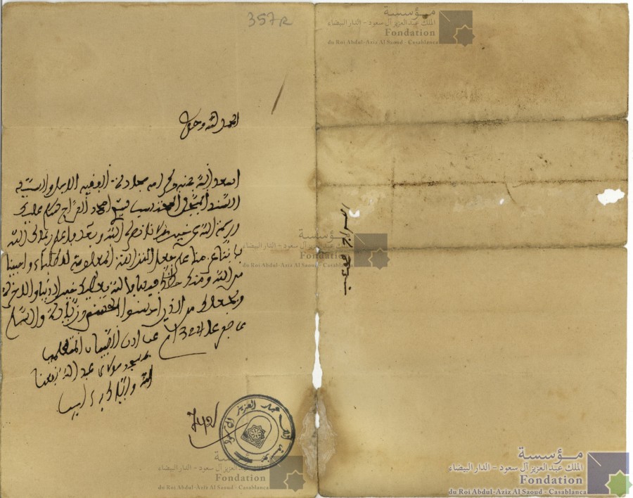 الحمد لله وحده أسعد الله بمنه وكرمه من مجادة الفقيه الأجل والسيد السند المبجل المحتسب سيدي أمحمد السراج سلام عليك ورحمة الله عن خير مولانا نصره الله وبعد فاعلم رعاك الله بأننا عزمنا على جعل النزاهة المعلومة للطلباء وأحببنا من الله ومنك حظك فيها فالله يعطيك خير الدنيا والأخرة ويجعلك من الذين أحسنوا الحسنى وزيادة والسلام 4 صفر عام 1324 عن إذن الصبيان المتعلمين بمسجد مولاي عبد الله نفعنا الله وإياك ءامين |