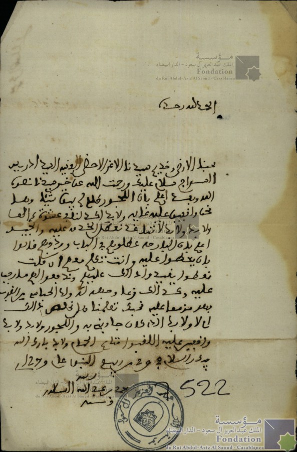 الحمد لله وحده محبنا الأرضى وخديم سيدنا الأعز الأحضى الفقيه السيد إدريس السراج سلام عليك ورحمت الله عن خير سيدنا نصره الله وبعد اعلم بأن اللجور طلع لم يبق شيئا وها نحن واقفين عليه غاية ولابد أكد لنا في عشرة آلاف ولابد ولابد لأننا غد نعطل الخدمة عليه والجير اعلم بأن البارحة عطلوهم في الباب وردوهم قالوا بأن يعطوا عليه وانت تكلم معهم إن قلت نعطوا يقيدوا ذالك عليهم وندفعوا لهم ما وجب عليه وكذالك زعا وجهه له ولد الحباسي من الغرب فهو مزمعا عليه نحبك تعلمنا هل نخلص ذالك أم لا ولابد الذي كان جاوبني به واللجور ولابد ولابد واقفين عليه اللقبوا متاع الحمام ولابد بارك الله فيك والسلام في 29 من ربيع النبوي عام 1279 محمد بن عبد الله السلاوي ومنه الله |