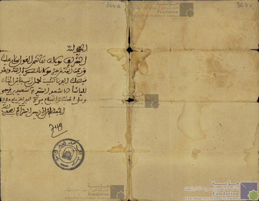 الحمد لله الشريف مولاي هاشمي الغول سلام عليك ورحمت الله عن خير مولانا نصره الله وبعد فيصلك الفرناتشية لحمل زنبلاين اثنان للباشا الأسعد سعيد فرجي وعلى المحبة والسلام في 5 صفر الخير عام 1320 المفضل بن إدريس السراج لطف الله به |
