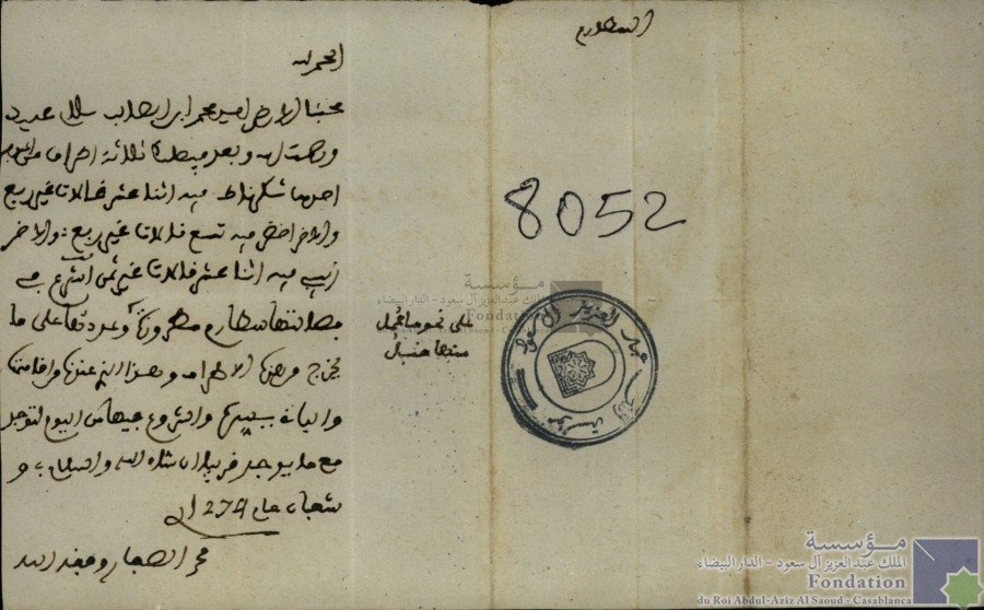 الحمد لله محبنا الأرضى السيد محمد ابن الطالب سلام عليك ورحمت الله وبعد فيصلك ثلاثة أطراف من عبد ربه أحد من شكرناك فيه اثنا عشر قالات غير ربع والاخر أخضر فيه تسع قالات غير ثمن اشرع في فصالتها سطارم مطروزة على ما حمل منها قبل وعددتها على ما يخرج نت هذه الاطراف وهذا الذي عندنا من اقامتها والباقي يسره والشروع فيها من اليوم لتوجه مع ما يوجد قريبا إن شاء الله والسلام في 9 شعبان عام 1274 محمد الصفار وفقه الله |
