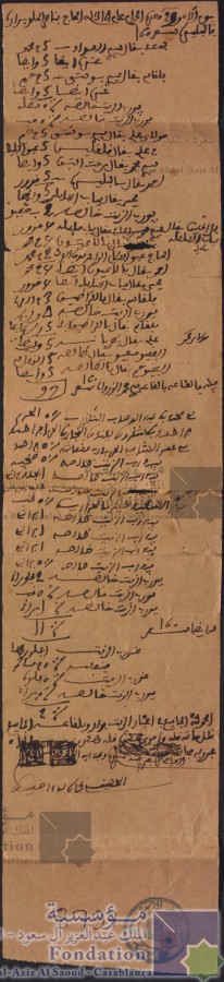 يوم الأحد 29 قعدة الحرام عام 1314 الحاج بناصر الحلوا بداره بالبليده سعر 160 سي عد بقال سيدي العواد 5 ح محمد عنده ايضا 5 وايضا بلقاسم بقال سيدي بوشتى 5 ح حم عنده ايضا 5 وايضا ____ بيد رب الزيت خالصه ت 0 سطله بيد رب الزيت خالصه ت 0 قف مولاي علي بقال سيدي بوشتى 25 حم الحاج علي بقال قلقلين 5 عبد الجليل سيدي محمد بقال برحبت التبن 5 وايضا احمد بقال بالبليده 5 قدور ____ (كذا) بقال بباب السلسلة 5 وايضا بيد رب الزيت خالصه 2 (كذا) (كذا) بقال بباب السلسلة 4 قدور (تقطيع) بقال بالاعيتون 24 محمد الحاج عبدالسلام الرايس سوق الفر(كذا) 22 محمد ______ احمد بقال بالاعيون ايضا 24 محمد يحيى بقال بباب السلسلة ايضا 4 قدور بلقاسم بقا ل بالقراطين 23 العربي بيد رب الزيت خالصه 4 رابح بلقاسم بقال بالشراطين ايضا 5 رابح ايضا مولاي مَحمد علي بقا بطريانة 5 وايضا الفقير سعيد بقال طالعة 5 التهامي الفقير حم بقال بالطالعة 5 وايضا _______ 97 قيد بالقاعة بالقاعة سيدي محمد الزروالي سعر 160 سي محمد بن عبدالوهاب التازي ت 0 الحرم الحاج احمد بن شقرون بفندق النجار بن الحرم 1 احمد سي عمر الشامي الحرم بدرب مشماشة ت 0 الحاج احمد بيد رب الزيت خالصه ت 0 (كذا) بيد رب الزيت خالصه 1 (كذا) براني بيد رب الزيت خالصه 1 (تقطيع) سيدي السعيد خبيز بالحرارين ت 0 قف بيد رب الزيت خالصه 1 براني بيد رب الزيت خالصه 1 براني بيد رب الزيت خالصه 1 براني بيد رب الزيت خالصه ت 0 براني بيد رب الزيت خالصه 2 (كذا) براني بيد رب الزيت خالصه ت 0 قف بيد رب الزيت خالصه ت 1 براني ________ فيه ايضا سعر 160 ت 11 ________ عند رب الزيت (كذا) بنفسه ت 0 ح سالم عند رب الزيت ت 0 جلون بيد رب الزيت خالصة ت 0 براني __________ ت 2 الحمد لله الجامع في اعبار الزيت بدار وبلقاعة الجامع قلل مائة قلة واحدى عشرة قلة (كذا) توقيع: عبد ربه (كذا) أمنه الله آمين وعبد ربه المعطي الحسيني كان الله له أمين |