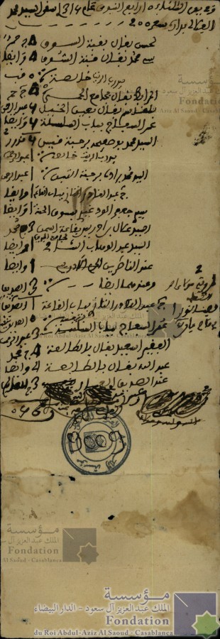 وفي يوم الثلاثاء 10 رابع النبوي عام 1314 سقي السيد محمد العيلالي برادة لحسن بقال بقبة السوق 4 ج حم سي محمد بقال قبة السوق 4 وأيضا بيد رب خالصه 0 قب المرابط بقال بجامع الحمرة 4 ج حم بلقاسم بقال بعين الخيل 4 عبد الرحمن عمر السفاج بباب السلسلة 4 وأيضا السيد محمد بوصفيحة برحبة قيس 4 قدور بدرب الزيت خالصه 1 عبد الرحمن السيد محمد برادة برحبة التبن 1 عبد الرحمن ج عبد القادر التازي بباب القاعة 1 وأيضا سيدي جعفر الودغيري بسوق الحنة 1 وأيضا السيد علال بن إدريس بقاعة السمن 3 ج محمد السيد عبد الوهاب الشامي 1 وأيضا وعندهما أيضا 3 الصديق ج عبد الهادي التازي بباب القاعة 1 الصديق عمر السفاج بباب السلسلة بنفسه 3 عبد الرحمن الفقير أسعيد بقال بالطالعة 4 وأيضا عند الصديق العبار 3 بلقاسم