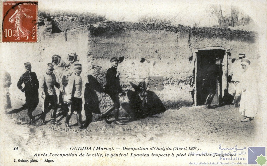 | Objet | Oudjda - occupation d'Oudjda (avril 1907) - après l'occupation de la ville, le général Lyautey inspecte à pied les ruelles fangeuses | الموضوع |