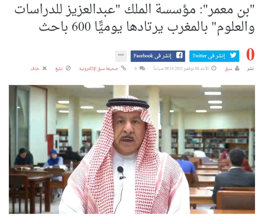انعقد يوم الجمعة 4 نوفمبر 2022، في مقر المؤسسة بالدار البيضاء، الاجتماع التاسع والخمسون لمجلس إدارة المؤسسة، برئاسة معالي الأستاذ فيصل بن عبد الرحمن بن معمر، نائب رئيس مجلس الإدارة. وتضمن جدول أعمال الاجتماع مناقشة برنامج عمل المؤسسة لسنة 2023، ومشروع ميزانيتها لنفس السنة، ومجموع الأنشطة والخطط المكتبية والثقافية والعلمية الموجهة لخدمة الباحثين داخل المغرب وخارجه.